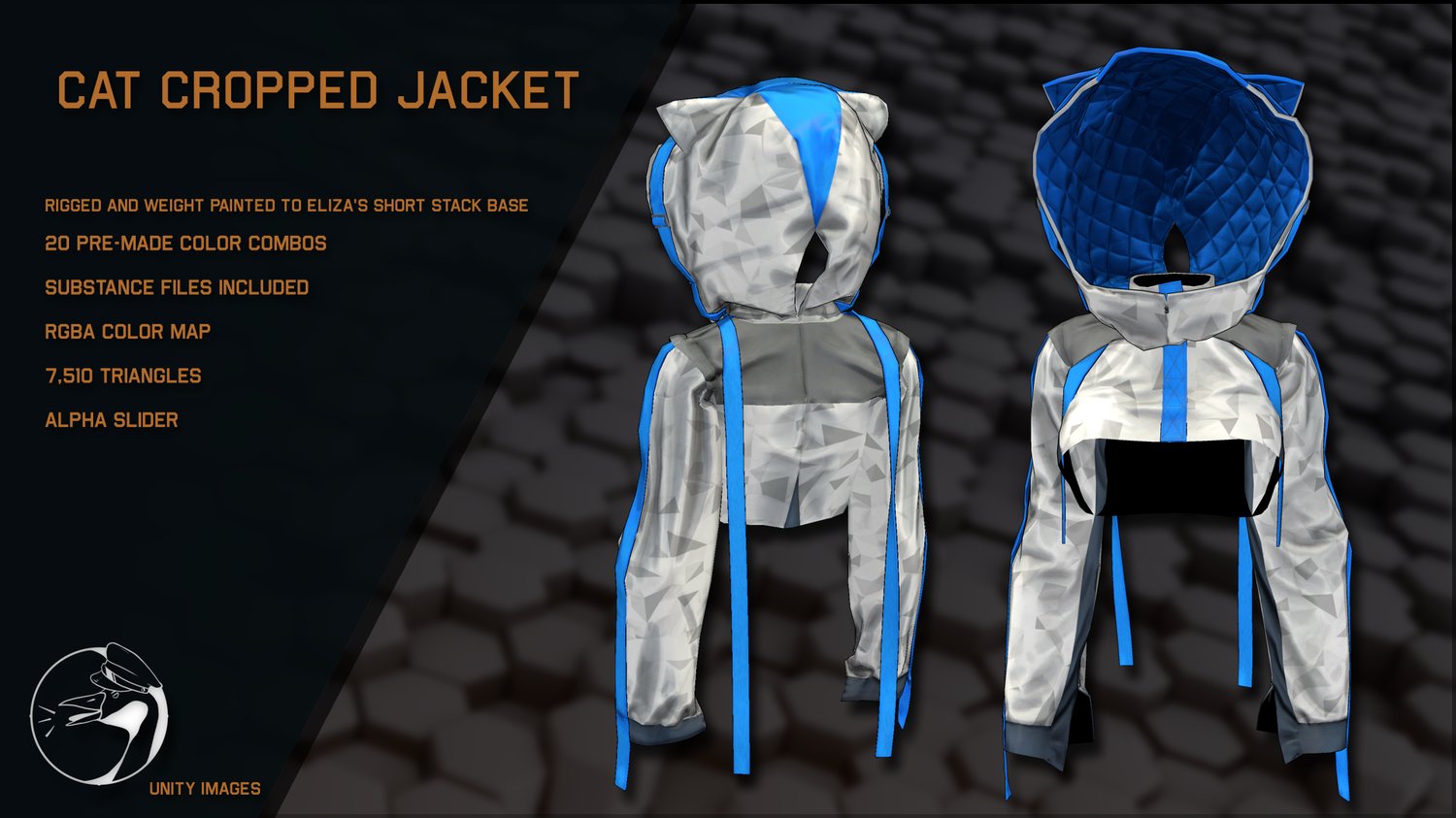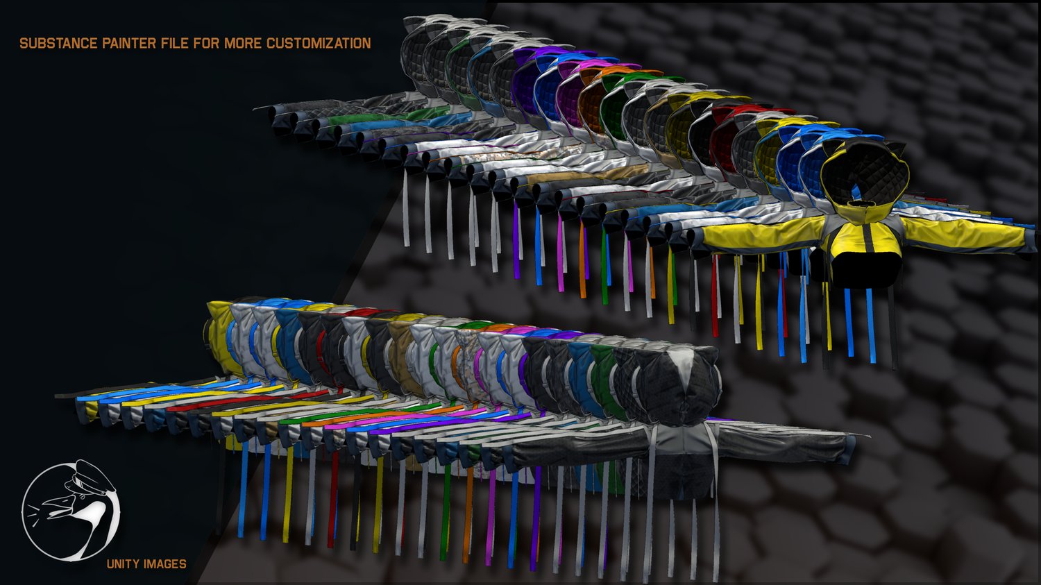 - 4k Textures: 20 Color options, Normal OpenGL, Ambient Occlusion, Metallic, Position gradient, 2 Combined shading maps for Poiyomi, Reflection, RGBA Mask, Smoothness, Specular level, Specular Tint Map, 4 Tilable 1k normals for use in RGBA, Opacity maps, Anisotropy,